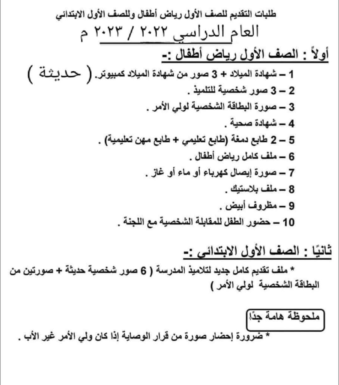 لا يقل عمر الطفل عن 6 سنوات ولا يزيد عن 9 سنوات بالنسبة للتقديم للحضانة لا يقل عمر الطفل عن 6 سنوات بالنسبة لطفل الصف الاول الابتدائيطريقة التقديم في الصف الأول الأبتدائي 2022