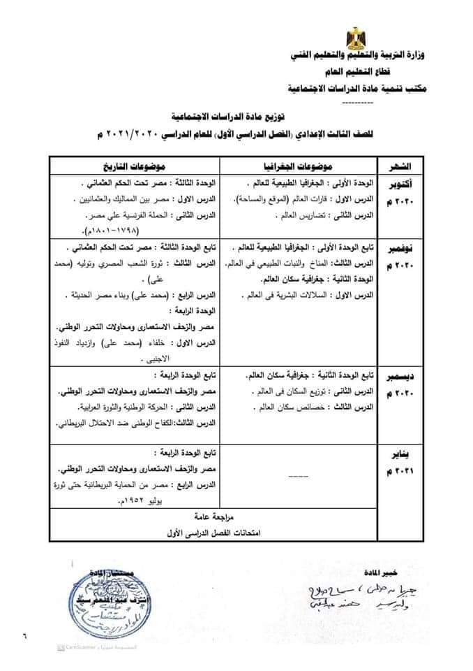 توزيع منهج الدراسات الصف الأول الأعدادي 2021,2021 , توزيع منهج الدراسات الصف الثاني الأعدادي 2021,2021, توزيع منهج الدراسات الصف الثالث الأعدادي 2021,2021