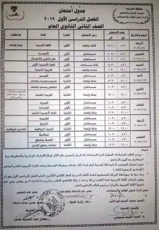 جدول امتحانات الصف الثاني الثانوي 2023 محافظة الشرقية