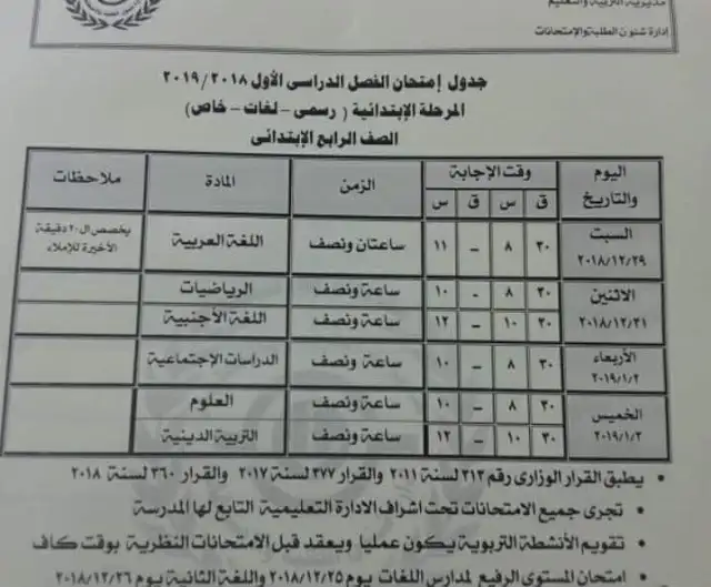تبدأ امتحانات الصفوف الأول والثانى والثالث الابتدائى أيام الأربعاء والخميس السابع والعشرون والثامن والعشرون من ديسمبر الجارى .
