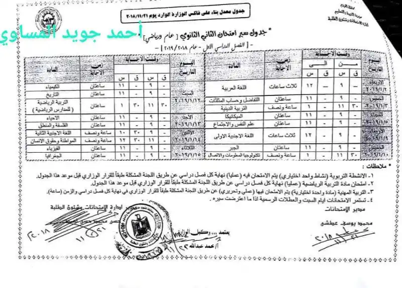 جدول الصف الثانى الثانوي عام كفر الشبخ