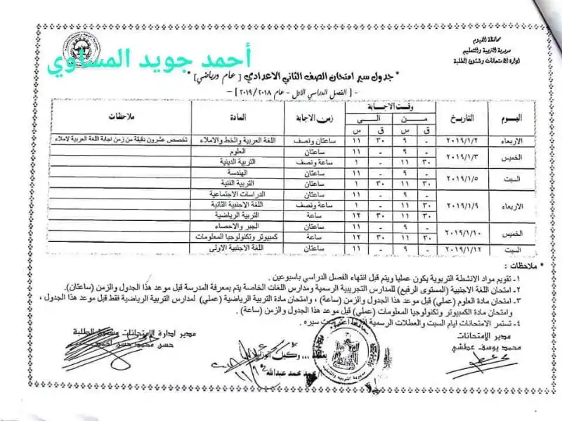 جدول امتحانات الصف الثاني الاعدادي بمحافظة الغربية2018 2019