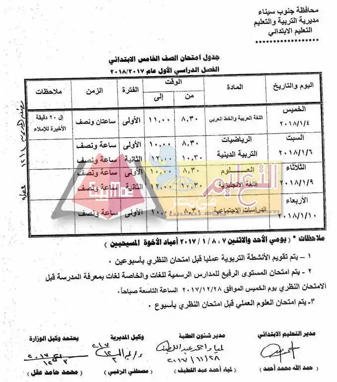 جدول امتحان نصف العام جنوب سيناء 2023 الصف الخامس الابتدائي