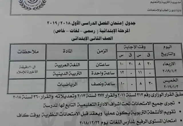 تبدأ امتحانات الصف الثاني الابتدائي الترم الأول يوم الخميس 20/12/2023 والفصل الثاني يبدأ يوم الأثنين والدور الثاني يبدأ يوم الأحد 7/7/2023