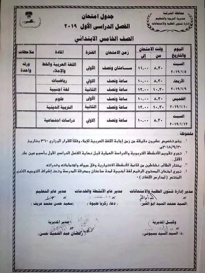 جدول امتحانات الصف الخامس الابتدائي 2023 محافظة الشرقية