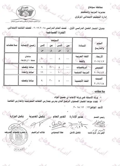 جدول امتحان محافظة سوهاج 2023 كل المراحل ترم اول