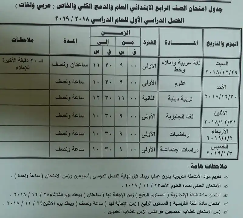 تبدأ امتحانات الصف الرابع الابتدائي الفصل الدراسي الأول يوم الثلاثاء 25/12/2023 والفصل الثاني يبدأ يوم السبت 20/4/2023 والدور الثاني يبدأ يوم 7/7/2023