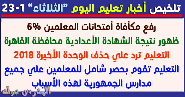 ننشر لكم أعزائي المتابعين تلخيص لأهم أخبار التعليم اليوم الثلاثاء الموافق 23/1/2018 ،والخبر الأول هو قيام وزارة التربية والتعليم بعمل حصر للمعلمين علي مستوي جمهورية مصر العربية من أجل توفير فرص عمل وسد العجز من المعلمين في الوزارة،صرح بهذا مساعد وزير التربية والتعليم والتعليم الفنى محمد مساعد
