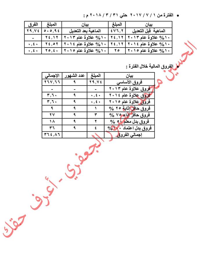 وفي هذه الصدد ننشر لكم أعزائي المعلمين الفروق المالية المستحقة نظير ضم الخدمة السابقة والتي سبق وقدمها لنا الأستاذ حسين الجعفري تحت مبادرة أعرف حقك ،والتي تشمل العديد من فروق ماهية وعلاوات وحافز 25% وحافز أداء وبدل معلم وبدل اعتماد ومكأفاة امتحانات للعديد من المدد والتي جاءت كالتالي: