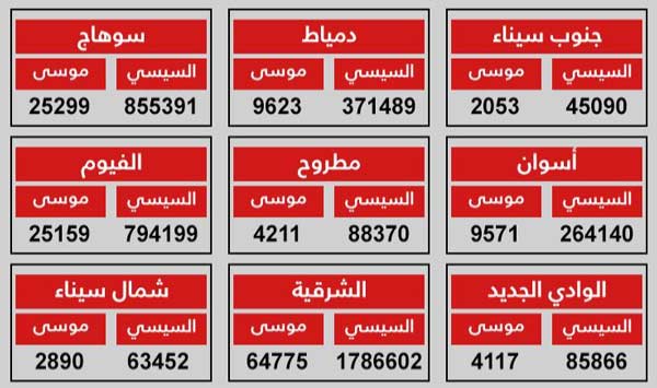 نسبة المشاركة في انتخابات الرئاسة 2018 جنوب سيناء ودمياط وسوهاج وأسوان ومطروح والفيوم والوادي الجديد والشرقية وشمال سيناء