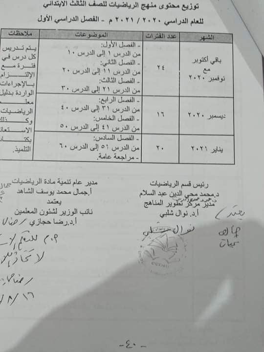 توزيع منهج الرياضيات الصف الثالث الابتدائي الترم الاول 2020