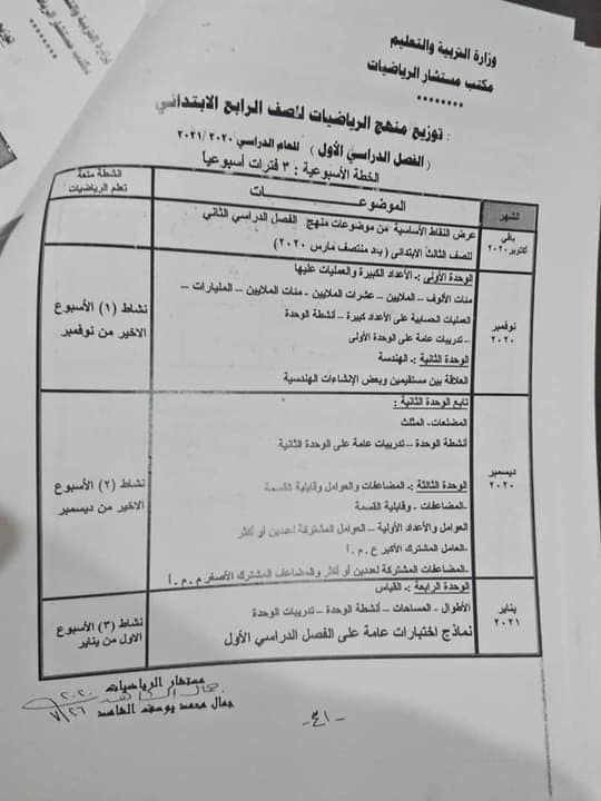 | توزيع منهج الرياضيات الصف الرابع الأبتدائي 2020 -2021 |