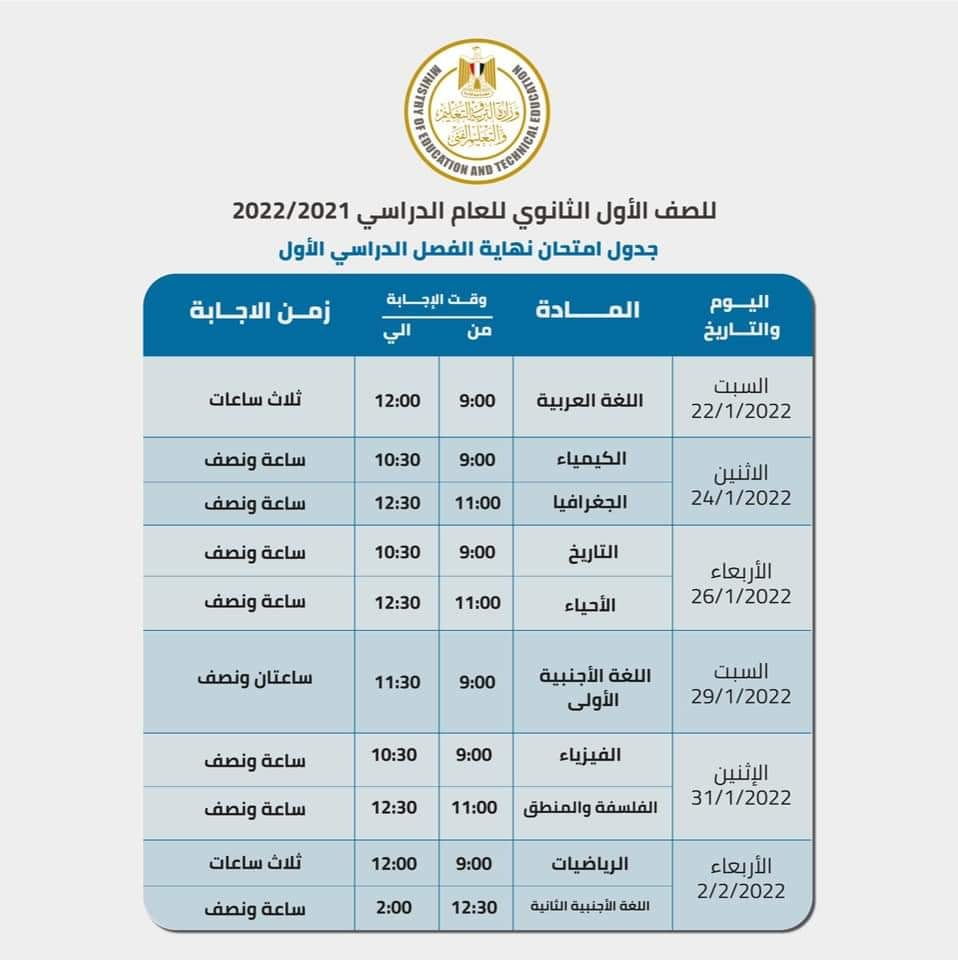 جدول امتحانات الصف الاول الثانوي 2021 لشهر فبراير,موعد امتحانات الصف الأول الثانوي, جدول اولي ثانوي ديسمبر , جدول اولي ثانوي تجريبي , جدول الثانوية العامة اولي
