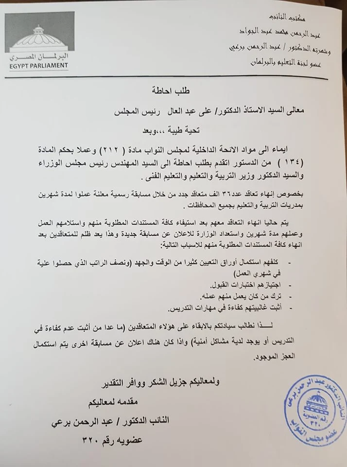 تقدم الدكتور عبد الرحمن البرعي عضو لجنة التعليم بالبرلمان بطلب إحاطة للسيد وزير التربية والتعليم والتعليم الفني الدكتور طارق شوقي والسيد المهندس رئيس مجلس الوزراء بخصوص إنهاء تعاقد 36 ألف متعاقد جديد من خلال مسابقة رسمية أعلنت عنها التعليم لمدة شهرين بمديريات التربية والتعليم بالمحافظات