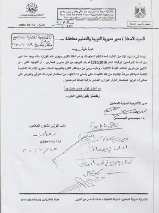 خطاب الاكاديمية المهنية بالتنبيه بسرعة الانتهاء من تقييمات السادة المعلمين المرشحين للترقى 2019 / 2020 حتى يتسنى للاكاديمية الانتهاء من اجراءات الترقى والعرض على معالى أ.د الوزير لاستصدار القرار الوزارى الخاص بترقية السادة المرشحين دفعه ٢٠١٤