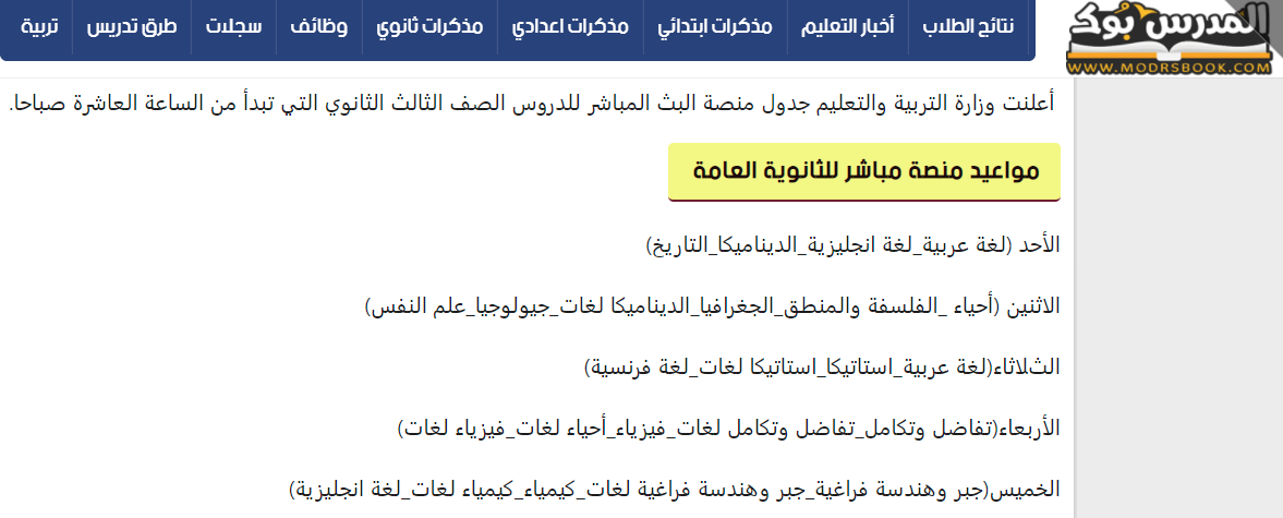 أعلنت وزارة التربية والتعليم جدول منصة البث المباشر للدروس الصف الثالث الثانوي التي تبدأ من الساعة العاشرة صباحا.
