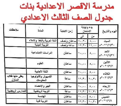 جدول امتحانات الصف الثالث الاعدادي محافظة الأقصر 2022 نصف العام