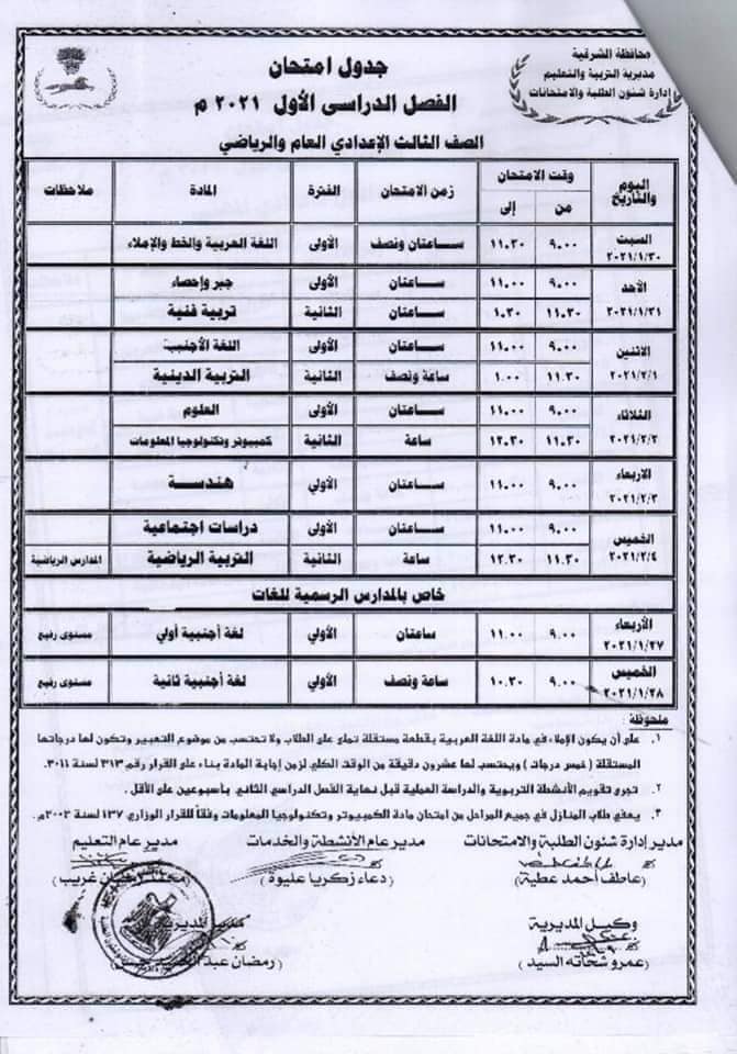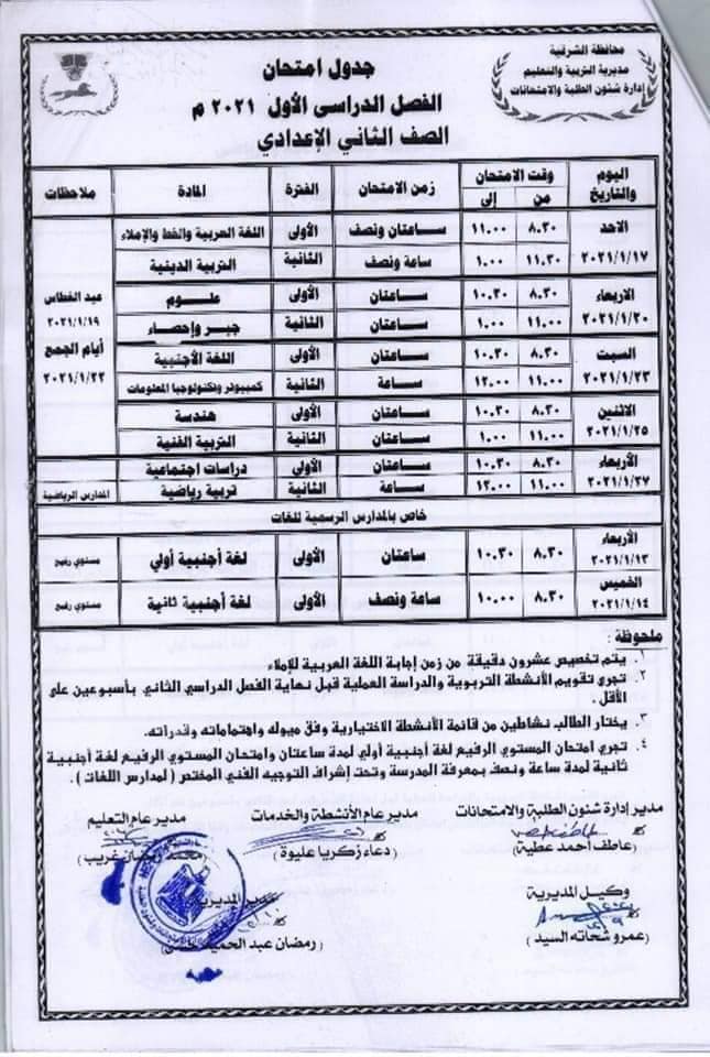جدول امتحان الصف الثالث الاعدادي محافظة الشرقية 2022 الترم الأول