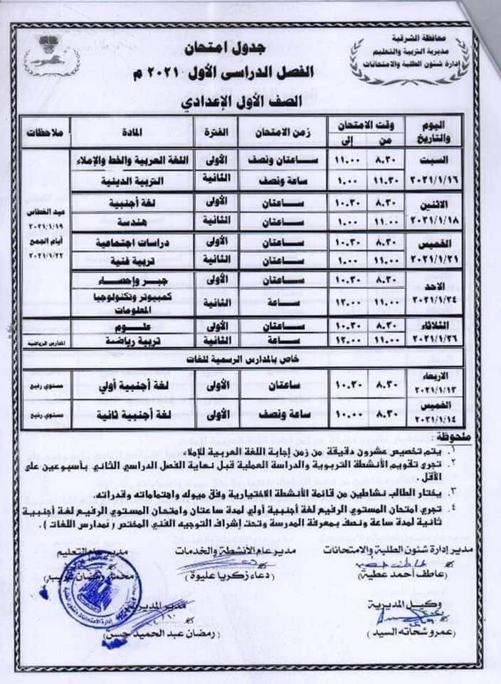 جدول امتحانات محافظة الشرقية الاول الاعدادي الترم الأول 2022