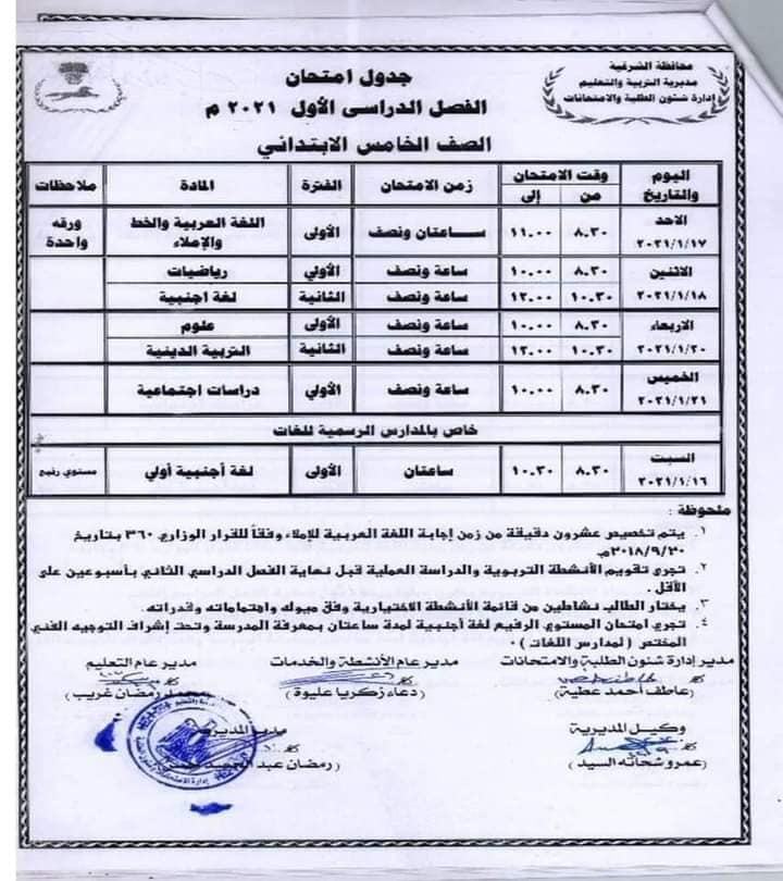 جدول امتحانات محافظة الشرقية 2022 الصف الخامس الابتدائي الترم الأول