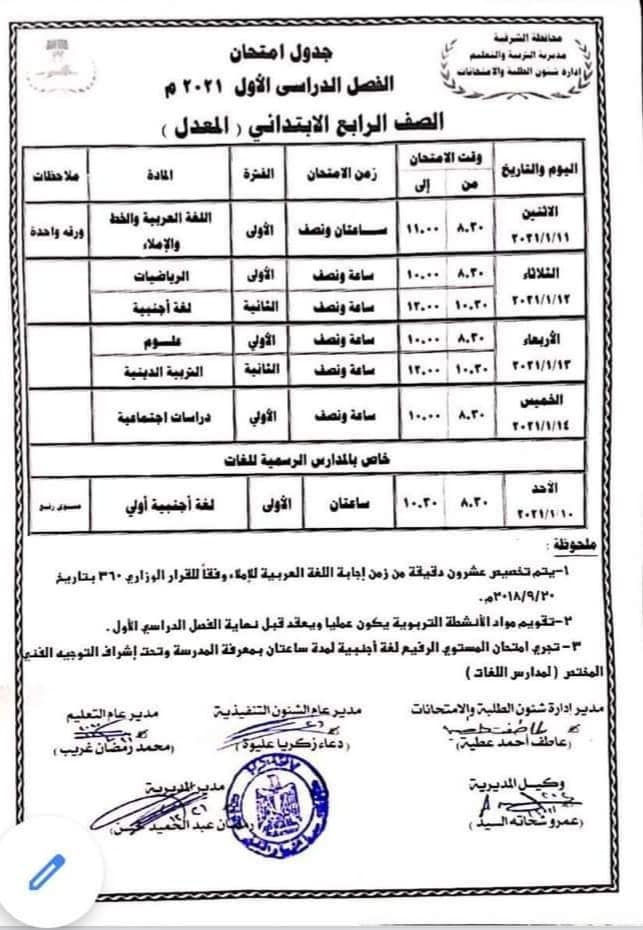 جدول امتحانات محافظة الشرقية 2022 الصف الرابع الابتدائي الترم الأول