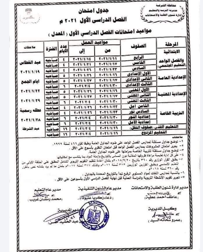 تعديل جداول امتحانات الفصل الدراسي الأول بمحافظة الشرقية 2022 السابقة