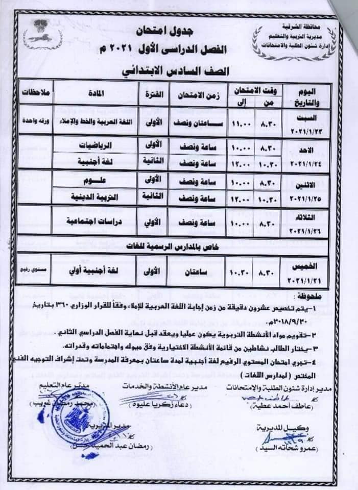 جدول امتحانات محافظة الشرقية 2022 الصف السادس الابتدائي الترم الأول