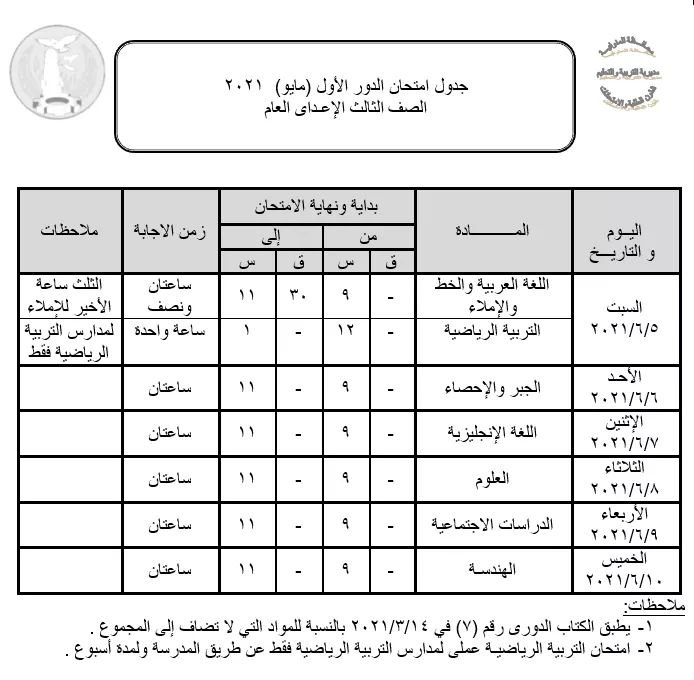 أعلنت مديرية التربية والتعليم والتعليم الفني بالمنوفية جدول اختبارات الدور الأول للشهادة الإعدادية العامة للعام الدراسي 2020 / 2022 وصرح أحمد سويد مدير المديرية أن الجدول المعلن يشمل المواد الأساسية التي تضاف للمجموع فقط بينما يؤدي الطلاب اختبار المواد التي لا تضاف للمجموع وفقا للكتاب الدوري رقم 8 الصادر بتاريخ 14 / 3 /2022 مضيفا أنه تقرر أن تؤدى الاختبارات العملية لطلاب مدارس التربية الرياضية بشبين الكوم ومنوف لمدة اسبوع على مستوى المدرسة مع مراعاة اتخاذ كافة التدابير والإجراءات الاحترازية للوقاية من عدوى فيروس كورونا .
