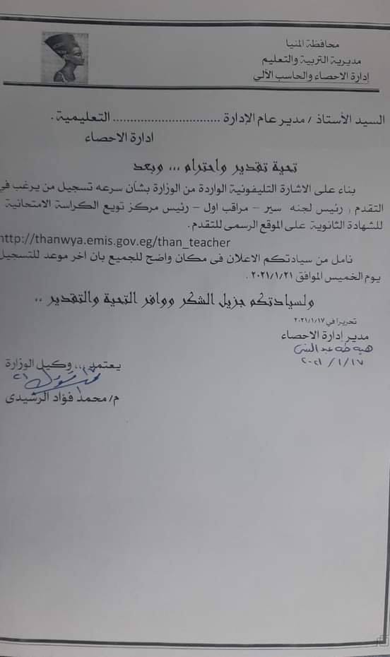 ارسلت مديرية التربية والتعليم بالمنيا إلي جميع المدارس فاكس عاجل بخصوص التقديم في الثانوية العامة للعمل رئيس لجنة - مراقب أول - رئيس مركز توزيع الكراسة الأمتحانية للشهادة الثانوية علي الموقع الرسمي للتقدم https://thanwya.emis.gov.eg/teachno