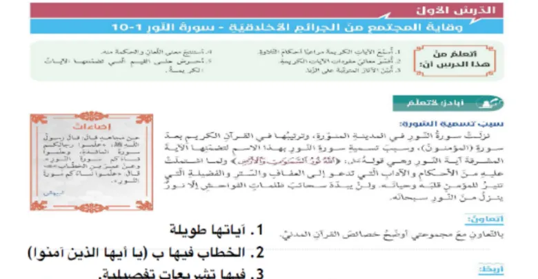 هذا الدرس يعرض للطالب سورة النور ليُساعده على الآتى