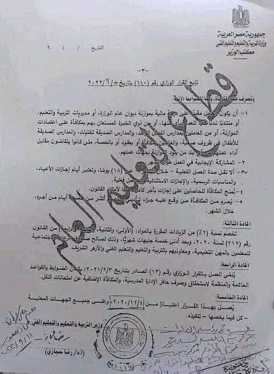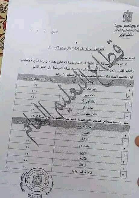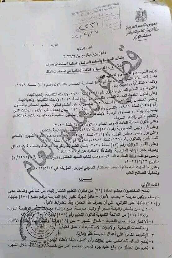 قرر وزير التربية والتعليم،د. رضا حجازي ،منح مكافأة إضافية عن امتحانات النقل لكافة العاملين بكل من وزارة التربية والتعليم والتعليم الفني،والجهات التابعة المستحقين لها،وبالفئات المالية،وأكد القرار الوزارى:منح أعضاء هيئة التعليم المخاطبين بأحكام قانون التعليم، مكافة شهرية، كبير المعلمين 155 جنيهًا، معلم خبير 140 جنيه، معلم أول (أ) 120 جنيها، معلم أول 85 جنيها، معلم مساعد 65 جنيها.