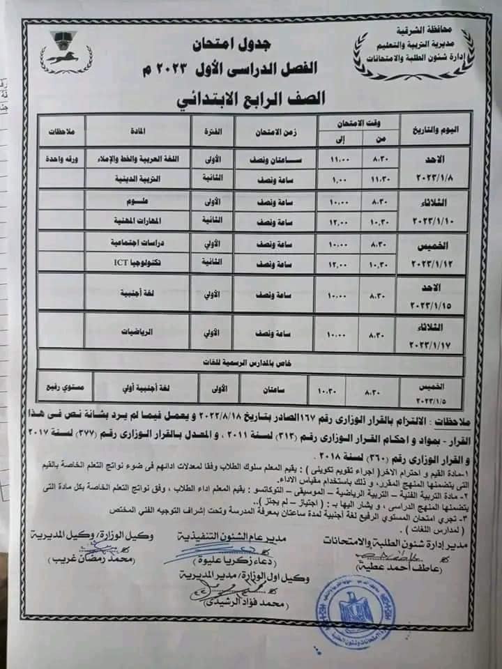 جدول امتحان طلاب الصف الرابع الابتدائي 2023 محافظة الشرقية الترم الاول