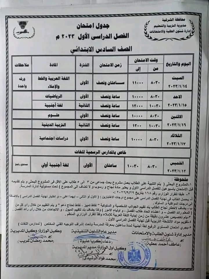 جدول امتحان طلاب الصف السادس الابتدائي 2023 محافظة الشرقية الترم الاول