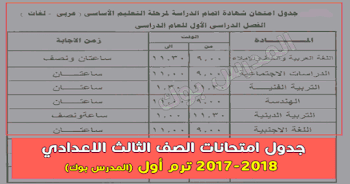 نوفمبر 05, 2017 جدول امتحان الصف الثالث الاعدادى 2018 محمد الجيزاوي جدول امتحانات الصف الثالث الاعدادي 2018 القاهرة والإسكندرية والشرقية والدقهلية والقليوبية والفيوم والإسماعيلية وبورسعيد وشمال وجنوب سينا...