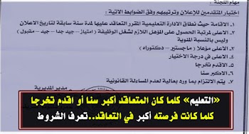 فبراير 07, 2019 التعليم كلما كان المتعاقد أكبر سنا أو اقدم تخرجا كلما كانت فرصته أكبر في التعاقد تعرف شروط القبول بعقود وزارة التربية والتعليم محمد الجيزاوي شروط الحصول علي عقد بوزارة التربية والتعليم نقدم لكم اليوم أعزائي المتابعين لصفحتكم التعليمية " المدرس بوك " شروط المفاضلة ب...