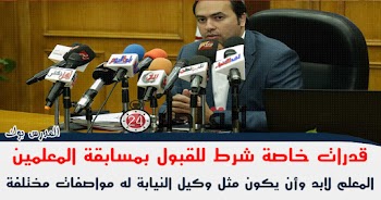 يونيو 22, 2019 التعليم مواصفات خاصة شرط مسابقة المعلمين الجديدة والمعلم يجب أن يكون مثل وكيل النيابة محمد الجيزاوي يتابع الخريجين الجدد والقدامي أخبار مسابقة المعلمين الجديدة بشكل يومي، خصوصا بعد انتهاء عقود المعلمين المقبولين العام الماضي، واعلان ا...